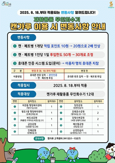 주요 개선 사항은 ▲보상 포인트 2배 인상 ▲1인 1일 투입 한도 조정 ▲휴대폰 인증 시스템 도입으로, ‘캔가루’ 재활용품 무인회수기에 적용된다.