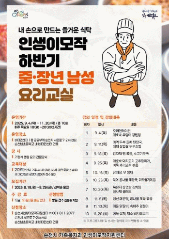 이번 특강은 중·장년 남성들의 은퇴 후 독립적인 식생활을 돕기 위해 마련됐으며, 가정에서 만들기 쉬운 생활 요리(기본 찌개 및 반찬 등)를 실습하는 과정으로 운영될 예정이다.