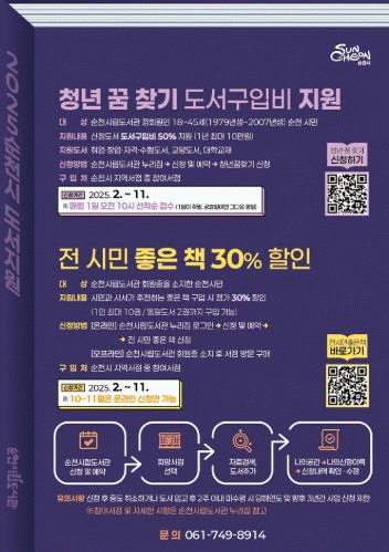 먼저 '청년 꿈 찾기' 사업은 만 18세부터 45세까지 순천 시민을 대상으로 도서구입비의 50%, 1인당 최대 10만 원을 지원한다.