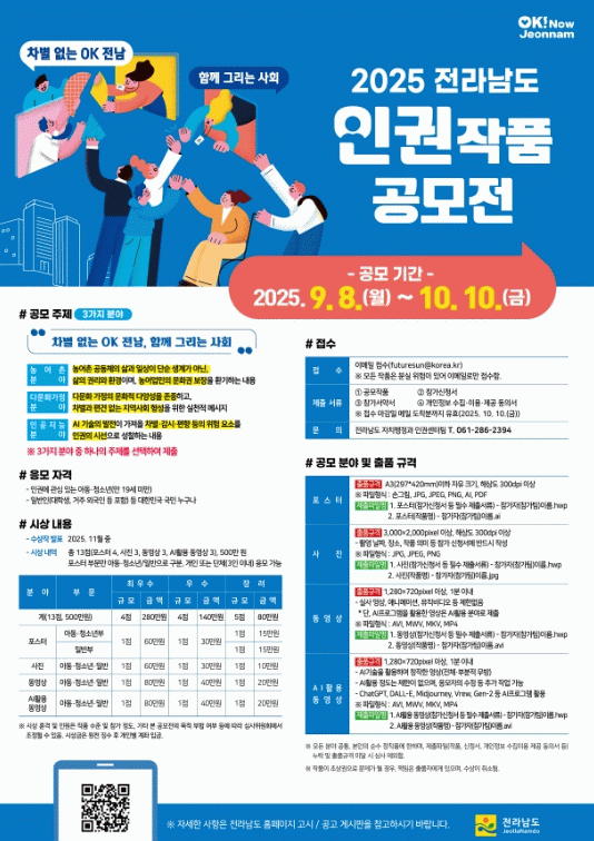 공모는 ‘차별 없는 OK 전남, 함께 그리는 사회’로, 농어촌, 다문화, 디지털 인권(AI) 등 전남의 현실과 시대적 흐름을 반영한 3대 주제를 중심으로 진행된다.