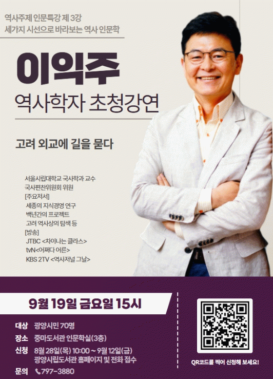 김현숙 도서관과장은 “1·2강 모두 시민들의 관심이 뜨거웠던 만큼 마지막 강연도 큰 호응이 이어질 것으로 보인다”며 “고려 외교의 역사적 의미를 통해 오늘날 우리가 나아갈 길을 함께 모색하는 시간이 될 것”이라고 말했다.