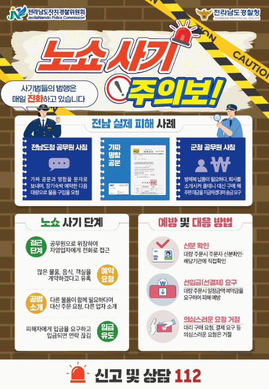 전남도자치경찰위원회는 전남경찰청과 함께 피해예방 전단지를 제작·배포하고 있으며, 전남도 실·국과도 협조해 관련 유관기관과 단체 등에 피해사례를 적극적으로 전파해 피해 예방에 나서고 있다.
