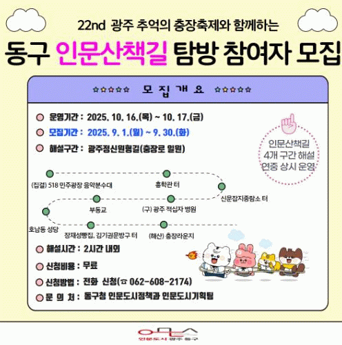 임택 동구청장은 “동구 인문산책길 탐방이 제22회 광주 추억의 충장축제 기간에 진행돼 그 의미가 남다르다”면서 “많은 시민들이 참여해 광주 원도심의 역사와 문화를 체험해 보길 바란다”고 말했다.