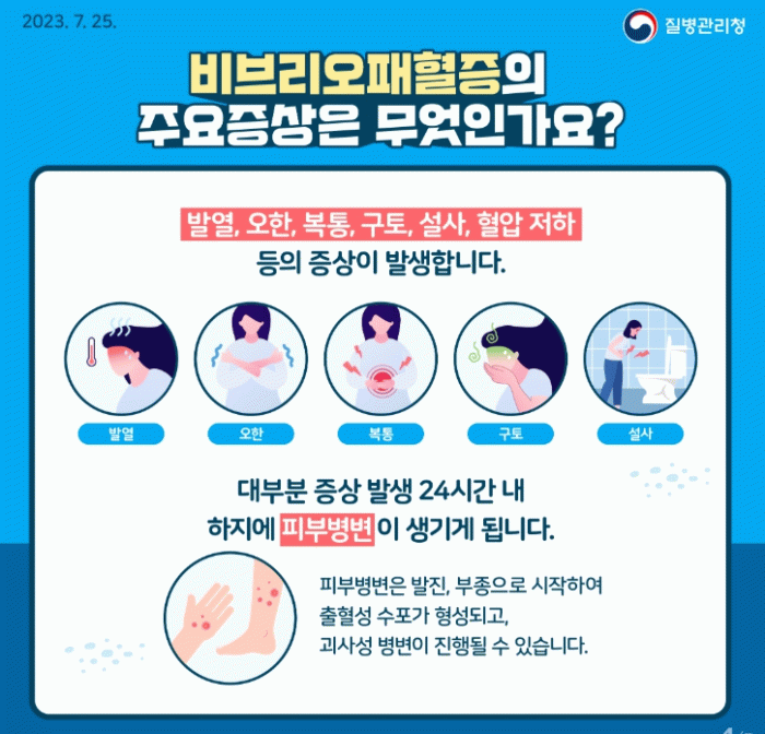 예방 수칙은 ▲어패류는 흐르는 물에 씻고 85℃ 이상에서 완전히 익혀 먹기 ▲피부에 상처가 있는 경우 바닷물 접촉 금지 ▲바닷물 접촉 후 물과 비누로 노출 부위 씻기 ▲어패류는 5℃ 이하 저온 보관하기 ▲어패류 취급 시 장갑 착용하기 ▲도마, 칼 등 조리 도구는 소독 후 사용하기 등이다.