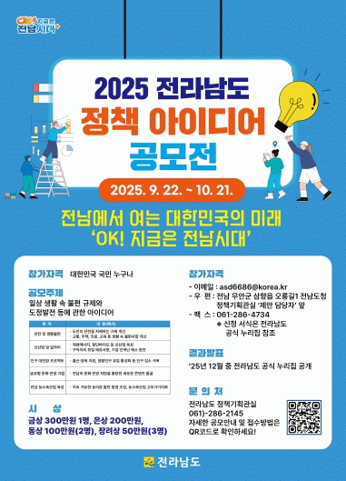 12월 중 자체 심사를 거쳐 우수 제안을 선정, 상장과 함께 시상금을 수여한다. 선정된 아이디어는 민선 8기 전남도정에 적극 반영할 계획이다.