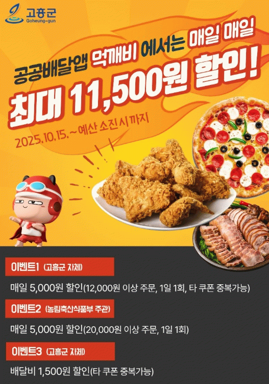 이번 먹깨비 외식비‘반값’ 행사는 고흥군이 ▲매일 5,000원 쿠폰과 ▲배달비 1,500원을 지원하고, 농림축산식품부가 ▲매일 5,000원 할인을 추가로 제공해 최대 11,500원의 할인 혜택을 받을 수 있다.
