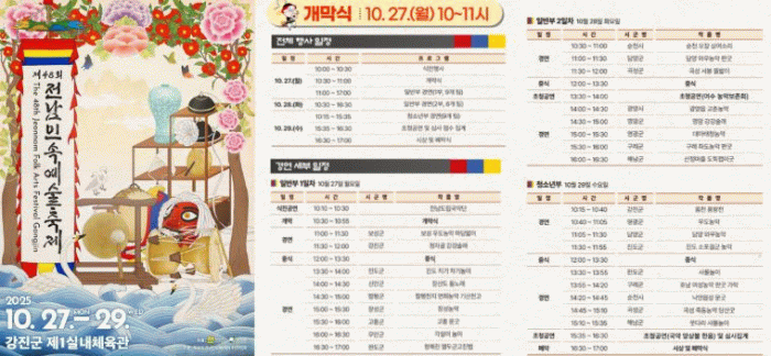 마지막 날인 29일에는 청소년부 경연이 진행되며, 강진 옴천초등학교를 비롯한 9개 학교·단체가 참여해 어린이와 청소년이 전통문화를 이어가는 무대를 선보인다.