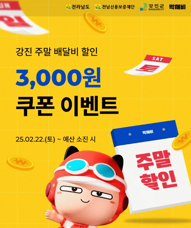 한편, 강진군에서는 매주 토·일요일 공공배달앱 먹깨비를 통한 1만 5천 원 이상 주문에 대해 3천 원 할인쿠폰을 지급하는 ‘주말 3천 원 할인이벤트’를 연중 추진 중이다.