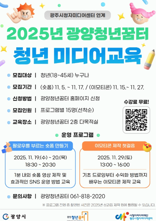 수강 신청은 광양청년꿈터 누리집(홈페이지)에서 선착순으로 접수한다. 신청 기간은 ▲‘팔로우를 부르는 숏폼 만들기’는 11월 5일부터 17일까지, ▲‘이모티콘 제작 첫걸음’은 11월 15일부터 27일까지다.