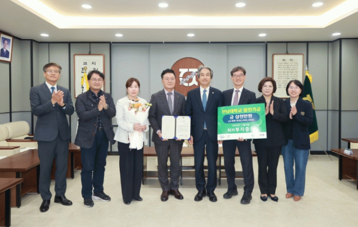 발전기금 전달식은 지난 11월 6일 대학본부 5층 접견실에서 열렸으며, 이근배 전남대 총장과 대학 주요 보직자, NH투자증권 조영래 중서부본부장과 민유선 광주금융2센터장을 비롯한 관계자들이 참석했다.