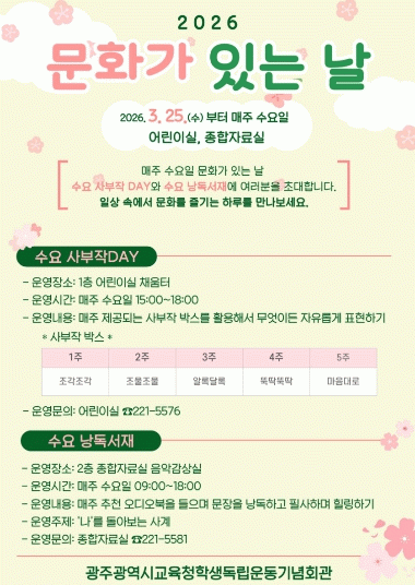 학생독립운동기념회관 김용일 관장은 “시민과 어린이들이 일상을 작은 축제처럼 즐길 수 있는 열린 도서관을 만들겠다”며 “매주 수요일마다 열리는 ‘문화가 있는 날’ 프로그램에 많은 시민과 어린이들이 참여하길 바란다”고 말했다.