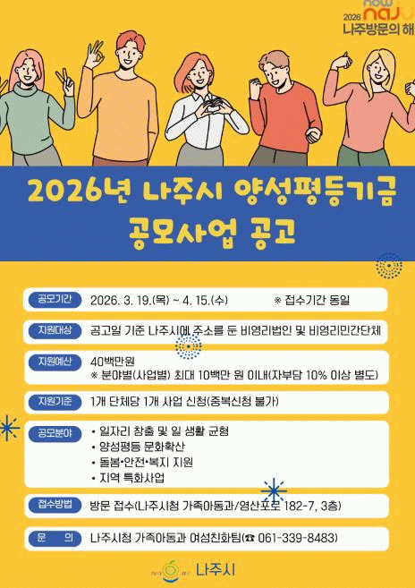 신청 자격은 공고일 기준 나주시에 주소를 두고 있는 비영리법인 또는 비영리민간단체로 신청을 희망하는 단체는 4월 15일까지 나주시청 가족아동과를 방문해 접수하면 되고 자세한 사항은 나주시청 누리집 고시·공고에서 확인할 수 있다.