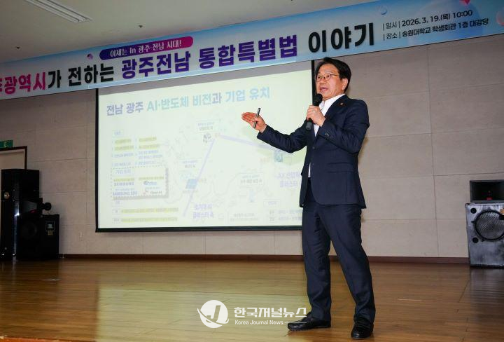 광주광역시(시장 강기정)는 19일 송원대학교 학생회관에서 ‘광주광역시가 전하는 광주전남 통합특별법 이야기’ 행사를 열어 통합특별법의 주요 내용과 통합 이후 변화상에 대해 청년들과 대화했다.