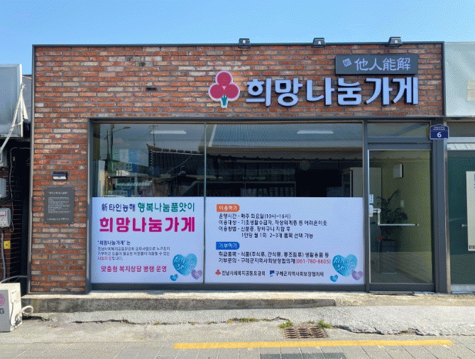 구례 희망나눔가게는 지역 주민이 식품류, 생활용품 등을 기부하면 기초생활수급자, 차상위계층 등 어려운 이웃이 필요한 품목을 무료로 이용할 수 있는 공간으로 매주 화요일 오전 9시부터 오전 12시까지 운영된다.