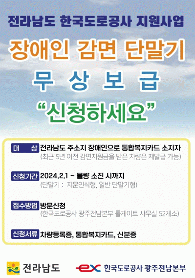 정혜정 전남도 장애인복지과장은 “고속도로 하이패스 감면 단말기 무료 지원은 장애인의 이동권 보호와 교통편의 증진에 필요한 사업”이라며 “앞으로도 유관기관과 지속적인 협업을 통해 장애인의 생활 불편을 줄이는 다양한 복지정책을 발굴·추진하겠다”고 말했다.