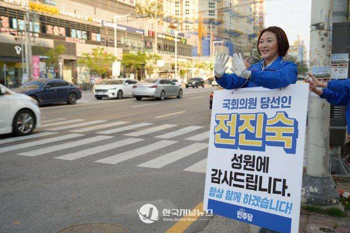 전진숙 국회의원 당선인은 이날 오전 '성원에 감사드립니다. 항상 함께 하겠습니다!' 라는 문구가 적힌 피켓을 들고 지역 주민을 향해 머리 숙여 인사했다. 전진숙 당선인을 마주친 주민들은 경적을 울려 인사하거나 엄지를 들어 보이는 등 다양한 방법으로 화답했다.