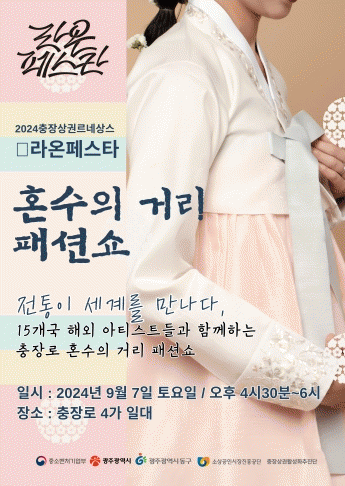 한복 패션쇼에서는 ‘2024 세계 여성미술연합 페스타’ 주인공인 해외 아티스트 100여 명이 참여하며 이중 18명이 모델로 무대에 오른다. 이들은 충장로 4가 한복 명인들이 제작한 한복을 입고 런웨이를 하며 국가를 대표하는 전통의상을 선보일 예정이다.