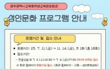 교육 윤규진 기자2025. 06.30[한국저널뉴스]광주광역시교육청학생교육문화회관은 지역 주민을 대상으로 ‘2025 성인문화프로그램’ 수강생을 선착순 모집한다. ‘2025 성인문화프로그램’은 시민들의 문화예술 활동 기회를 확대하고, 건강한 여가 문화를 즐길 수 있는 기회를 제공하기 위해 마련됐다. 프로그램은 ▲실버라인댄스 ▲노후자산관리 ▲한글교실 ▲스마트폰 활용법 ▲서예교실 등 5개 강좌로 구성됐으며, 7월 11일~11월 14일 주 1회씩 총 16회 운영된다. 특히 6월 재개관에 따라 새롭게 2개 강좌가 운영된다. 재개관과 함께 문을 연 광주학생스포츠종합지원센터…