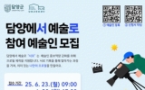 담양군 윤규진 기자2025. 06.23[한국저널뉴스](재)담양군문화재단은 '담양에서 예술로, 서로' 프로그램에 참여할 담양 예술인을 모집한다. 올해로 2회째 진행하는 이번 프로그램은 예술인의 홍보역량을 지원하는 동시에 각 장르별 예술인 간 네트워크와 협업을 더욱 확장하는데 중점을 두고 있으며, 예술인 프로필 사진 및 영상 제작을 지원한다. 촬영은 스튜디오 및 개인 작업공간 등에서 진행되며, 예술인의 활동 이력과 작품소개, 예술적 가치를 드러낼 수 있도록 인터뷰 또한 진행할 계획이다. 참여신청은 6월 23일부터 6월 30일까지 공고문과 포스터에 첨부된 구글폼으…