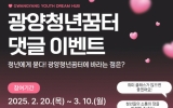 광양시 윤규진 기자2025. 02.21[한국저널뉴스]광양시와 광양청년꿈터가 지역 청년들의 목소리를 직접 듣기 위해 오는 3월 10일까지 ‘양청년꿈터 댓글 이벤트’를 진행한다. 광양시에 거주하는 18세부터 45세까지의 청년이라면 누구나 이번 이벤트에 참여할 수 있다. 참여 방법은 간단하다. 먼저 광양청년꿈터 인스타그램을 팔로우하거나 네이버 블로그를 이웃 추가한 뒤, ‘광양청년꿈터에 바라는 점’ 게시글에 희망 프로그램이나 청년정책에 대한 의견을 댓글로 작성하면 된다. 이후, 팔로우 인증과 댓글 작성 화면을 네이버 폼으로 제출하면 참여가 완료된다. 휴대전화 번호당…