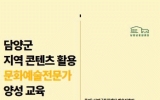 광양시 윤규진 기자2025. 01.17[한국저널뉴스](재)담양군문화재단은 다음달 7일까지 문화예술 전문가 양성 기초과정 참여자를 모집한다고 밝혔다. 재단 문화예술 전문가 양성 과정은 담양군 지역 문화를 기반으로 문화예술전문가를 육성하기 위한 교육으로, 2월 20일부터 4월 3일까지 총 7회차 과정을 매주 목요일(1·2회차 목·금요일) 오후 5시에 진행한다. 이번 교육은 지역 문화를 활용한 콘텐츠 기획을 주제로 다방면의 문화·예술 전문가로부터 문학, 축제, 공연, 뮤지컬과 같은 콘텐츠뿐만 아니라 경영, 마케팅 등에 대한 실무적·학문적 강의를 들을 수 있는 자리로 마련…