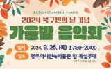 남구 윤규진 기자2024. 09.24[한국저널뉴스]광주시 북구가 다가오는 구민의 날을 기념하고 주민 화합을 도모하기 위해 오는 26일 ‘북구민의 날 기념행사’를 연다고 24일 밝혔다. 구민의 날은 ‘북구민의 날에 관한 조례’에 따라 북구 설치령 공포일인 ‘9월 26일’을 기념하고자 지난 2020년에 지정된 날로 북구는 매년 이날 지역주민의 대통합과 애향심 고취를 위해 기념행사를 이어오고 있다. 광주역사민속박물관 광장 일원에서 개최되는 이번 기념행사는 지역주민 1천여 명이 참석한 가운데 ‘식전 공연’을 비롯해 ‘기념식’과 ‘가을밤 음악회’가 오후 5시 30분부터 7…