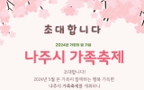 나주시 윤규진 기자2024. 05.08[한국저널뉴스]전라남도 나주시가 가정의 달을 맞아 10일 빛가람호수공원에서 온 가족이 함께하는 ‘나주시 가족축제’를 개최한다고 8일 밝혔다. 전라남도와 나주시가 공동 개최하는 이번 행사는 가정의 달 행사와 세계인의 날 행사가 어우러져 ‘다양한 가족, 다양한 행복’이라는 주제로 펼쳐진다. 이번 행사에서는 ▲행복(모범)가정상 유공자 표창 ▲20여 개 체험부스 ▲다문화 전통놀이 ▲청소년 치어리딩 ▲샌드아트 공연 등이 펼쳐진다. 아울러 부대 행사로 ▲가족사진전 ▲천연염색 소품 전시회도 선보일 예정이다. 특히 ‘한마음 가족 공굴리기’…
