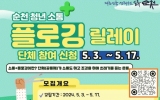 순천시 윤규진 기자2024. 05.07[한국저널뉴스]순천시는 오는 17일까지 순천시에 거주하거나 활동하는 청년단체(모임)을 대상으로 청년소통+플로깅 릴레이에 참여자를 모집한다고 밝혔다. 이번 청년소통+플로깅 릴레이는 소통 프로그램을 접목한 플로깅으로 청년 단체(모임)간 소통도 하고 걸으면서 쓰레기를 줍는 운동으로 순천시에서 활동하는 청년(모임)을 대상으로 진행된다. 플로깅 릴레이는 우리지역의 생태, 문화, 환경 등 지역문제에 대한 청년들의 관심도 향상뿐만 아니라 청년주도의 공익활동을 통해 지역 애착심 형성과 건전한 청년 문화를 조성한다는 취지로 마련됐다. 플로깅은…