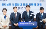 담양군 윤규진 기자2024. 05.07[한국저널뉴스]노관규 순천시장은 정병회 순천시의회 의장, 이병운 국립순천대학교 총장, 더불어민주당 순천‧광양‧구례‧곡성(갑) 김문수 국회의원 당선인, 순천‧광양‧구례‧곡성(을) 권향엽 국회의원 당선인과 함께 전남 동‧서 지역간 갈등을 초래한 전남도 단일의대 공모 강행에 대한 공동입장문을 7일 발표했다. 이날 순천시장은 “전남의대를 둘러싼 전남지역 동·서 간 극한 갈등의 모든 책임은 전남도에 있다”고 말했다. “전남도의 일방적이고 성급한 행정이 이번 전남권 의대 문제 사태를 자초했고, 광역 자치단체의 책무인 이해조정과 갈등 해…