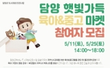 영광군 윤규진 기자2024. 04.30[한국저널뉴스]담양군은 오는 5월 11일과 5월 25일에 담양문화회관(담양읍 지침6길 29) 광장에서 ‘담양 햇빛가득 육아·중고마켓’ 행사를 개최한다고 밝혔다. 도시재생 인정사업의 하나로 추진하는 이번 행사는 육아 가정의 경험을 공유하고 부모들의 지역 내 커뮤니티를 형성하고자 마련됐다. 오후 2시부터 6시까지 운영하며, 육아‧중고물품 장터 외에도 어린이들을 위한 에어바운스 놀이 공간 운영과 매직벌룬쇼, 매직버블쇼 등 다양한 프로그램을 진행한다. 행사 참여자 모집은 5월 8일까지 진행한다. 참가비는 무료이며 부…