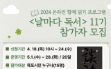 목포시 윤규진 기자2024. 04.22[한국저널뉴스]목포시립도서관이 온라인 함께 읽기 프로그램 '2024 날마다 독서' 11기 참가자를 모집한다. 올해 상반기 '날마다 독서'는 오는 5월 1일부터 28일까지 개설되어 신영복의 '담론'을 함께 읽을 예정이다. 20일간 전문강사의 안내로 매일 정해진 분량의 독서를 한 뒤 기억에 남는 글귀와 단상을 참가자들과 공유하는 방식으로 운영된다. 지난 9, 10기 참여자들은 ‘혼자라면 읽기 힘든 책을 끝까지 완독할 수 있어 뿌듯하다.’, ‘날마다 배경지식을 함께 알려주니 책을 읽는데 많은 도움이 됐다.’ 등의 소감을 밝혔다.…