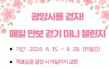 광양시 윤규진 기자2024. 04.12[한국저널뉴스]광양시가 걷기를 통해 건강한 지역사회 분위기를 조성하고자 ‘매일 만보 걷기’ 미니 워크온 챌린지를 운영한다고 12일 밝혔다. 걷기 챌린지는 모바일 걷기앱 워크온을 활용해 실시간으로 걸음 수를 측정하며 일상 속 걷기를 실천할 수 있도록 지원하는 프로그램이다. 광양시민이면 누구나 함여할 수 있으며, 오는 15일부터 29일까지 15일간 진행된다. 참여 방법은 워크온에서 ‘광양시 공식 커뮤니티’에 가입하고 챌린지 탭에서 광양시 걷기 챌린지 ‘참여하기’를 누른 후 목표 마일리지가 쌓일 때까지 스마트폰을 소지하고 걸으면 된…