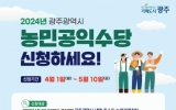 광주광역시 윤규진 기자2024. 03.26[한국저널뉴스]광주광역시는 4월 1부터 5월 10일까지 주소지 동 행정복지센터에서 ‘2024년 농민공익수당’을 신청받는다. 대상은 2023년 1월 1일 이전부터 계속해 광주광역시에 주소와 농업경영정보(농지, 농장)을 두고 실제 농업에 종사하고 있으면서 전년도 기본형직불금을 지급받은 농업경영체 경영주 또는 가축·곤충 사육 농업경영체 경영주다. 다만 농업경영체 공동경영주, 부부 또는 동일 세대이면서 경영체를 분리해 여러 건으로 등록한 경우 한 사람만 신청할 수 있다. 2022년도 농업 외 종합소득이 연 3700만원 이상이거나 공…
