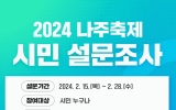 화순군 윤규진 기자2024. 02.15[한국저널뉴스]전라남도 나주시는 ‘2024 나주축제’ 기획단계부터 시민들의 다양한 의견을 수렴하기 위해 ‘시민 설문조사’를 실시한다. 지역사회의 기대와 요구를 적극 반영하기 위해 실시하는 이번 설문조사는 28일까지 온·오프라인으로 진행된다. 온라인은 QR코드 및 URL주소를 통해 참여할 수 있고 오프라인은 읍면동 행정복지센터에서 설문지로 응답하면 된다. 나주시민이나 축제에 관심 있는 자라면 누구나 참여할 수 있으며 약 3분 가량 소요된다. 설문내용은 ▲인적사항(성별, 연령, 거주지) ▲축제 발전방안(시기, 기간, 장소, 개선점…
