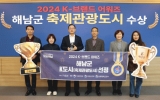 장흥군 윤규진 기자2024. 01.25[한국저널뉴스]해남군이 지난 24일 2024 K-브랜드 어워즈 축제관광도시 분야를 수상했다. K-브랜드 어워즈는 기획재정부·행정안전부·문화체육관광부 등 8개 기관이 후원하는 시상식으로 창의적이고 선진적인 브랜드 경연을 통해 산업 경쟁력을 제고하고 국가 경제 발전에 기여한 우수 콘텐츠 및 브랜드를 선정했다. 해남군은 사계절 축제 완성을 바탕으로 체류형 로컬관광 등 다양한 분야에서 괄목할 만한 성과를 이뤄내면서 축제관광도시 분야에서 수상의 영예를 안았다. 해남군은 사계절 축제로 봄에는 달마고도 힐링 축제, 어린이 공룡 대축제를 개…