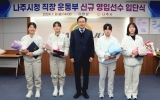 광양시 윤규진 기자2024. 01.11[한국저널뉴스]전라남도 나주시는 최근 시청사 이화실에서 2024년 나주시청 직장운동부 사이클, 육상팀의 신규 및 재계약 선수 입단식을 가졌다고 11일 밝혔다. 나주시에 따르면 올해 사이클·육상팀에서 총 7명의 선수를 신규 영입 및 재계약했다. 사이클팀에선 나윤서, 전미연 선수를 새롭게 영입했으며 김하은, 문수진 선수와는 연장 계약했다. 육상팀은 신소망, 김홍성, 마재현 선수가 나주에 새 둥지를 틀었다. 이번 선수 영입과 재계약은 나주시청 직장운동부 경쟁력 향상에 큰 힘이 될 것으로 기대된다. 사이클 김하은 선수는 …
