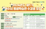 여수시 윤규진 기자2024. 01.11[한국저널뉴스]여수시 평생학습관에서 오는 15일부터 19일까지 5일간 제1기 프로그램 수강생을 선착순 모집한다. 평생학습관 상설 프로그램은 이순신도서관 1층에서 3개월 과정으로 12월까지 3기로 나눠 운영되며, 학습자는 매 기수별로 모집된다. 제1기 프로그램은 △문화예술 △인문교양 등 총 43개 과목으로 주중 과정 외 직장인들을 위한 야간·주말 과정으로 구성, 학습자의 평생학습 기회 확대를 위해 마련됐다. 오는 29일부터 4월 20일까지 과목별 25명의 정원으로 운영되며, 교육비는 무료이나 과목별 재료비는 학습자가 부담…