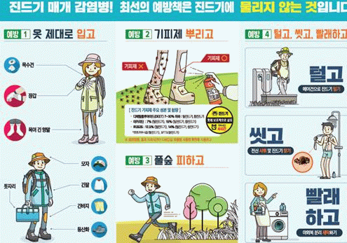 SFTS 예방을 위해서는 ▲피부를 노출하지 않는 작업복 착용 ▲진드기 기피제 사용 ▲풀밭·풀숲 방문 자제 ▲귀가 후 전신 샤워 및 야외복 분리 세탁 등이 중요하다.
