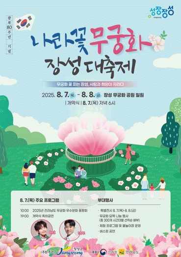 먼저, 오는 7일부터 8일까지 이틀 동안 광복 80주년 기념 ‘나라꽃 무궁화 장성대축제’가 장성무궁화공원(장성읍 영천리 985)에서 열린다. 전국 4개 지역에서 순차적으로 열리는 산림청 전국단위 행사로, 전남을 대표해 장성군에서 개최된다.