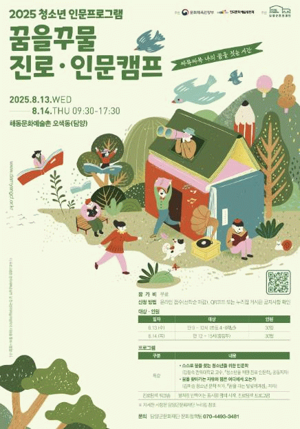 이번 캠프는 문화체육관광부와 한국문화예술위원회에서 후원하는 「2025 청소년 인문프로그램」의 일환으로, 진로에 대한 고민이 시작되는 청소년과 함께 ‘꿈’에 대한 구체적인 설계방안을 모색하는 자리가 될 예정이다.