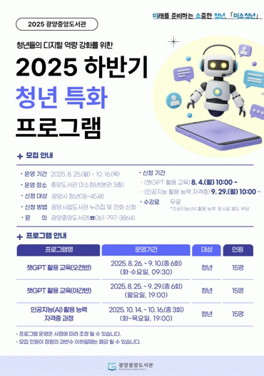 ‘챗GPT 활용 교육’은 8월 4일 오전 10시부터, ‘인공지능(AI) 활용 능력 자격증 과정’은 9월 29일 오전 10시부터 각각 선착순 접수를 시작한다. 신청은 광양시립도서관 누리집 또는 전화로 가능하다. 기타 자세한 사항은 광양중앙도서관으로 문의하면 된다.