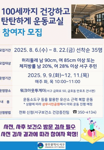 서구는 지역 주민들의 건강한 생활습관 형성과 만성질환 예방을 위한 프로그램 ‘100세까지 건강하고 탄탄하게 운동교실’의 참여자를 모집한다.