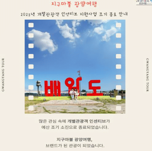 한편, 광양시는 천만 관광객이 찾는 글로벌 관광도시 실현을 목표로, 개별관광객 인센티브를 비롯해 ‘내·외국인 관광객 유치 여행사 인센티브’, ‘윤동주 테마 관광상품 인센티브’ 등 체류형 관광 확산과 관광산업 활성화를 위한 다양한 지원사업을 적극 추진하고 있다.