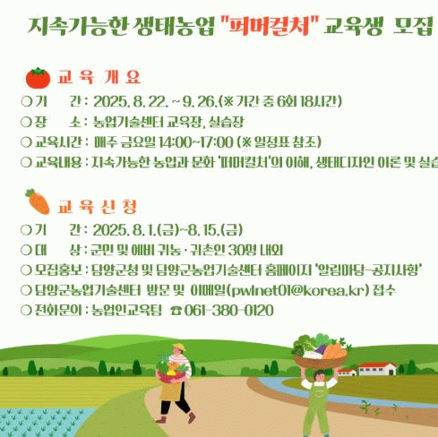 모집 대상은 담양군민과 예비 귀농·귀촌인으로, 8월 15일까지 선착순 30명을 모집한다.
