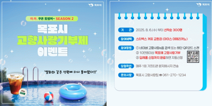 시 관계자는 “1차 이벤트를 통해 많은 분들께서 목포에 대한 애정과 응원을 보여주셨고, 이로 인해 지역 업체들도 실제 매출 향상을 체감할 수 있었다”며 “이번 2차 이벤트는 기부자 여러분께 감사의 마음을 전하고, 목포 고향사랑기부제가 지역사회에 더욱 힘이 되기를 바라는 마음에서 준비했다”고 전했다.