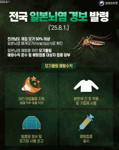 군 관계자는 “여름철 야외 활동 시 일본뇌염 매개 모기에 노출될 가능성이 높아지므로 기피제 사용 등 모기물림 예방수칙을 실천해 주시길 바란다”며 “예방접종 대상자는 접종 일정에 맞춰 예방접종을 완료할 수 있도록 적극적인 협조를 부탁드린다”고 말했다.
