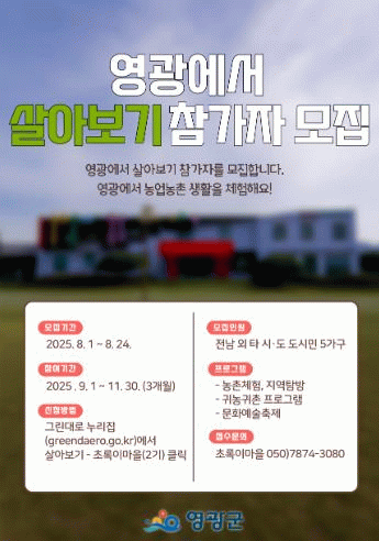 영광군농업기술센터 고윤자 소장은 “이번 프로그램은 영광군의 농촌 생활을 직접 체험하며 귀농·귀촌을 준비할 수 있는 소중한 기회”라며, “영광군에서 새로운 출발을 꿈꾸는 많은 분의 참여를 기다린다”고 전했다.