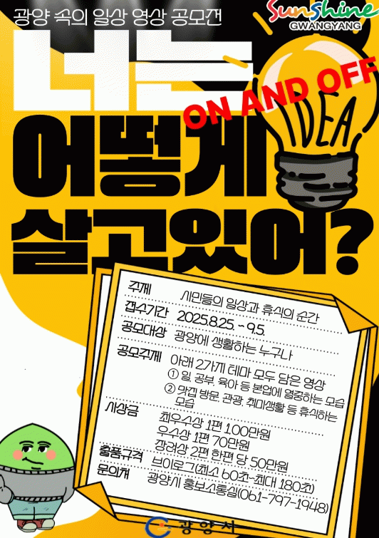 광양시 관계자는 “시민의 눈으로 본 광양의 일상과 휴식을 ‘ON과 OFF’라는 키워드로 담아내고자 한다”며, “창의적이고 따뜻한 시선으로 만들어진 브이로그를 기다린다”고 전했다.