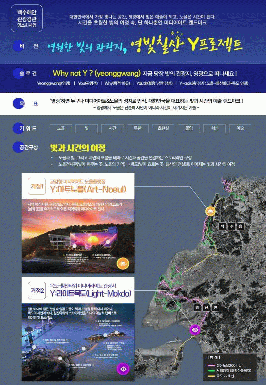 사업내용은 백수해안도로를 중심으로 경관자원과 문화콘텐츠를 집약·강화하는 사업으로 ▲해안 경관 인프라 확충 ▲노을전시관 리모델링 및 미디어파사드 조성 ▲칠산타워와 목도를 잇는 미디어라이트 연출 등을 통해 영광군을 체류형 관광도시로 탈바꿈시키는 것을 목표로 한다.