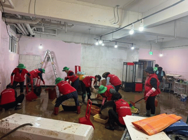 피해 현장은 갑작스러운 빗물 유입으로 진흙과 오물이 집기들과 뒤엉켜 참혹한 상황이었으며, 자원봉사자들은 진흙과 쓰레기 제거, 집기 세척, 상가 바닥 물청소 등 피해 상가의 신속한 영업 재개를 위한 복구 활동에 힘을 보탰다.